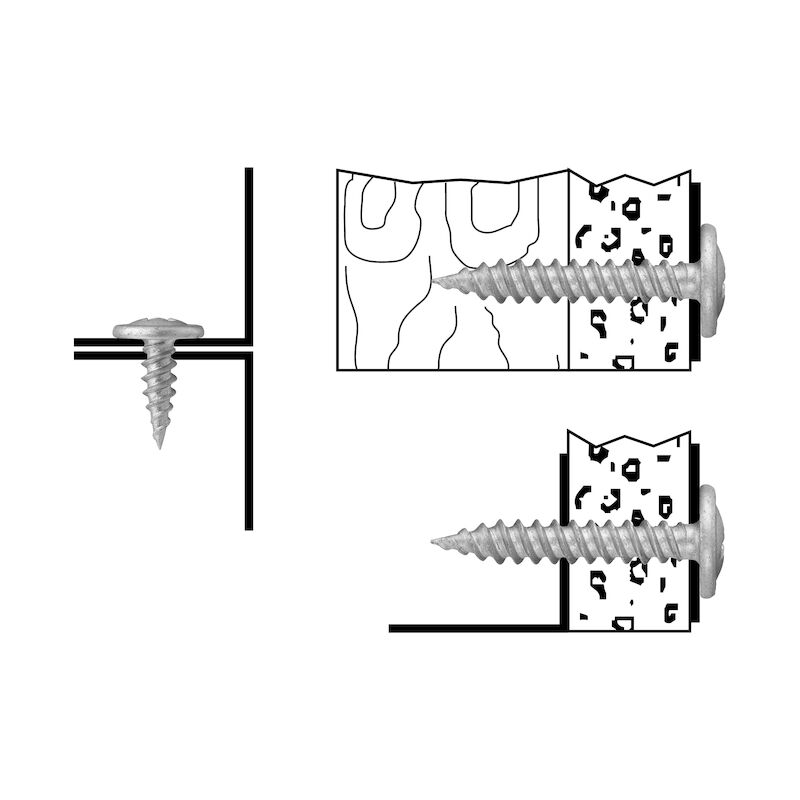 Montageskruv för trä- och stålregel är speciellt utformad för att ge en säker och effektiv infästning där ett plant huvud krävs. Skruvens vassa spets och dubbelledande gängor ger omedelbart grepp och säkerställer snabb och stabil montering i både trä- och stålreglar med en tjocklek på upp till 1 mm. Dess utformning gör den även lämplig för att fästa plåt mot plåt.